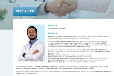 Sono il Dr. Manuele Drovandi, Radiologo Diagnostico e Interventista, specializzato nel trattamento mini-invasivo di patologie vascolari, muscolo-scheletriche e oncologiche.